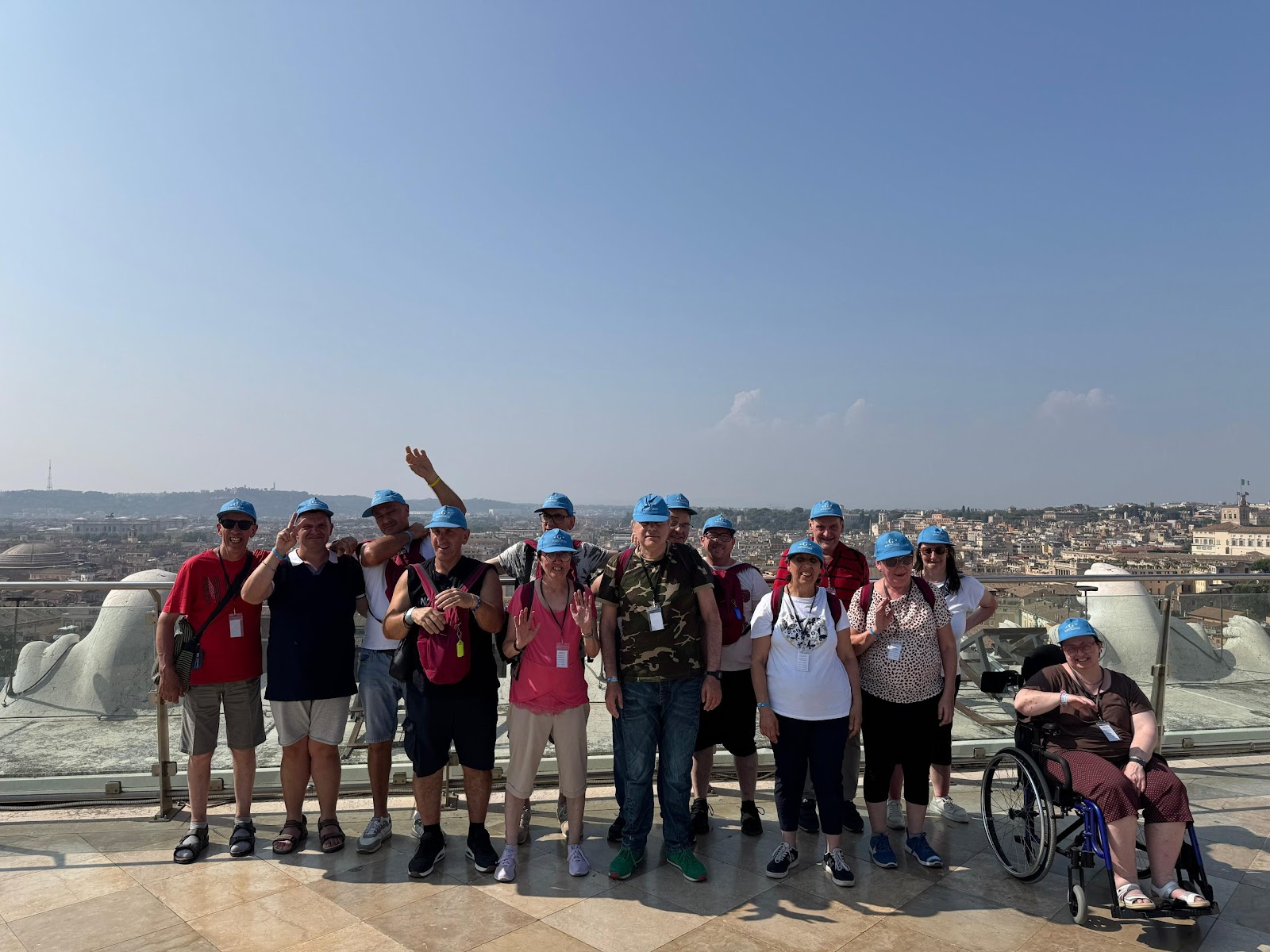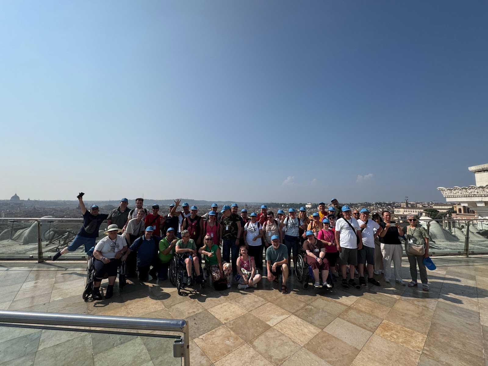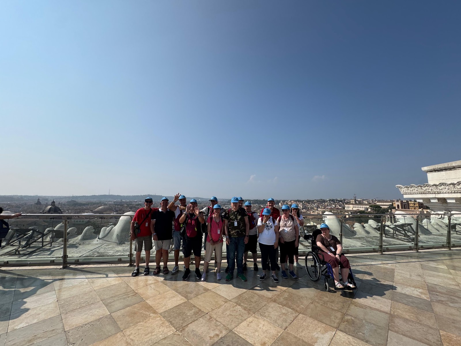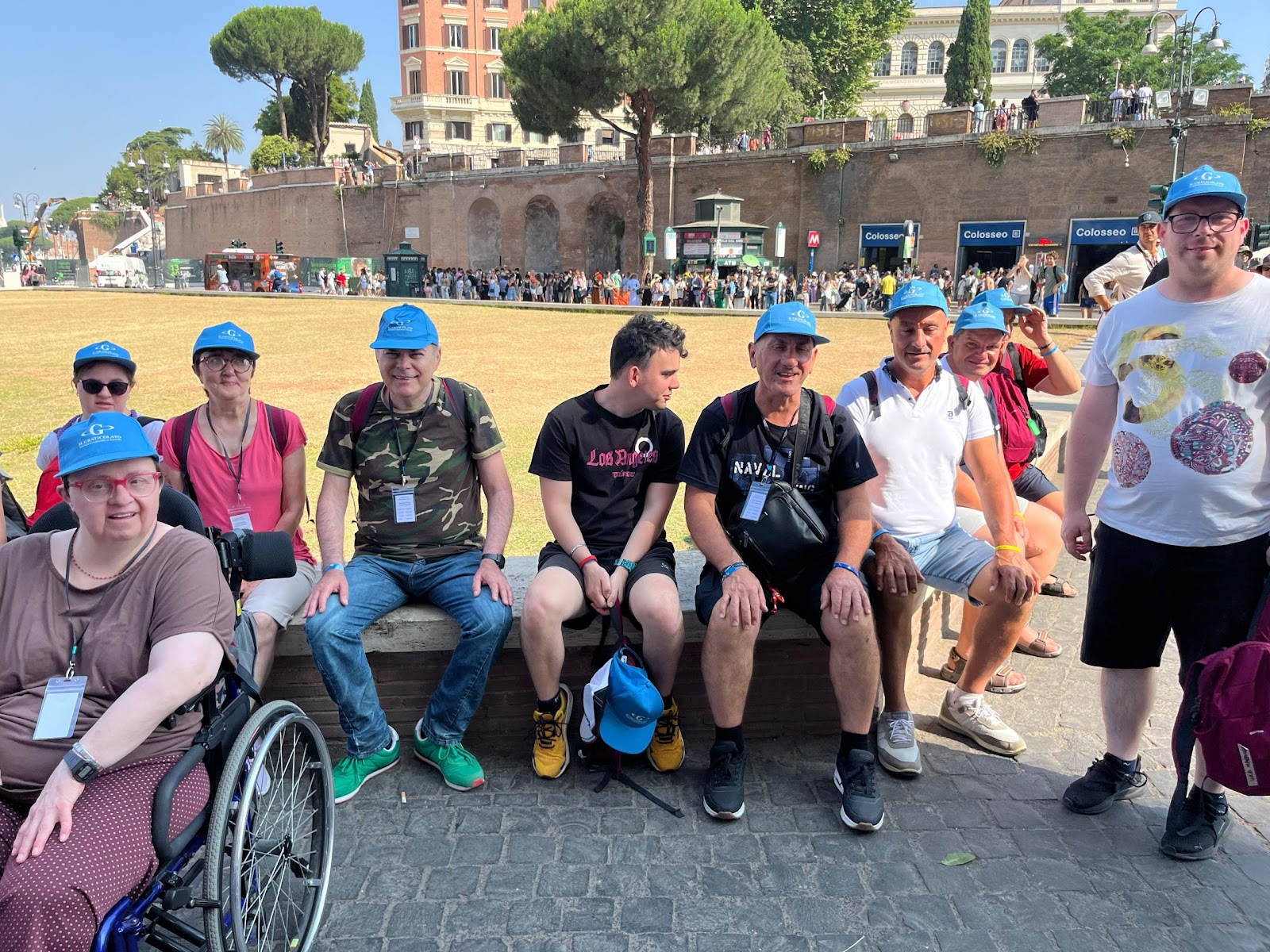Gruppo di pellegrini del Centro Paolo VI in visita ai monumenti di Roma: Piazza del Popolo, Piazza di Spagna, Piazza Venezia e Colosseo, durante una giornata di sole nella capitale. Momenti di condivisione, cultura e spiritualità prima del rientro.